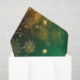 Diseño de papel higiénico con temática invernal con copos de nieve dorados, anillos de oro y luces borrosas y destellos sobre un fondo degradado verde.