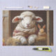 Este ilustracion reconfortante representa a una oveja blanca esponjosa con una colorida bufanda de punto, enclavada en el heno dentro de un rústico cajón de madera dentro de un granero. Un lindo conejo marrón se asoma por detrás de la oveja. Flores y hojas de otoño coloridas adornan el primer plano, creando un ambiente encantador y acogedor.