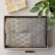Este diseño de papel de tejido presenta una fotografía matutina tranquila de un amanecer en la playa sobre el agua. La imagen es un fondo con un patrón del mismo fondo en forma de rectángulo que crea un diseño de collage a cuadros. Ideal para envolver regalos u otros proyectos creativos. Diseño de Ms_Jade. © Ms_Jade