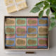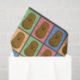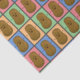 Papel tisú divertido y colorido de estilo pop art con un patrón de rectángulos de diferentes colores, cada uno con una patata marrón feliz en el medio.