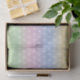 Este papel tisular utiliza un patrón japonés tradicional llamado Asanoha, que es un símbolo de vitalidad. Los diseños de Asanoha son a menudo usados en productos y ropa para niños y bebés con la esperanza de promover un fuerte crecimiento y salud. Este diseño de Asanoha está decorado con tonos arcoiris pastel. Debido a que las interesantes líneas geométricas crean el efecto visual de las estrellas brillantes, esta cinta seguramente gustará a niños y adultos y será apropiada para fiestas, costura, envoltura de regalos y artesanías.