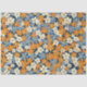 Un patrón floral vibrante cubre toda la imagen. Las flores, pequeñas y estilizadas, en tonos naranja, azul claro y blanco roto, están densamente dispuestas sobre un fondo azul marino. Las flores tienen un aspecto ligeramente imperfecto, de aspecto pintoresco, con variaciones en la saturación de color y en la forma que le dan al patrón un aspecto texturado, casi pintado a mano. El patrón repetido crea un efecto visual alegre y ocupado.