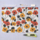 La imagen presenta un vibrante patrón floral con estilizadas flores rojas y naranjas, cada una con audaces centros negros. Las flores están unidas por delgados tallos negros y hojas, todas colocadas sobre un fondo claro. El diseño es minimalista pero llamativo, evocando una estética moderna retro o de mediados de siglo con líneas depuradas y colores contrastantes.