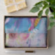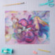 Colorido, caprichoso, divertido payaso rosa tocando la corneta con un búho expresivo y notas musicales alegres, flores, hojas en vibrantes colores rojo, fucsia, violeta, púrpura, azul, blanco, pintura acuarela de Bulgan Lumini (c)