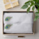 A white tissue paper with five vibrant peacock feather eyes that form a border along one side.
