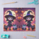 Este papel de tejido presenta una linda bruja con un disfraz negro con gatos y calabazas en la noche de Halloween. ¡Excelente para tus artesanías o como envoltura de regalo!