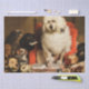 Este diseño presenta un cuadro del artista inglés Sir Edwin Henry Landseer (1802-1873), conocido por sus pinturas de animales, en particular caballos, perros y marcas. Esta imagen muestra a un perro caniche blanco sentado en la silla de un juez, como si estuviera presidiendo una corte de perros. Hay muchas criaturas caninas diferentes, diferentes razas de perro, rodeando al juez que ejerce su autoridad con su postura segura de sí mismo. Es una imagen cómica y humorística de animales que actúan como humanos. El arte original fue pintado en 1840.