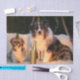 Design presenta una fotografía humorística de perros vestidos para celebrar Nochevieja. Están sentados en una manta peluda y llevan gorras fiestas. Una botella de champán está abierta delante de ellos.
