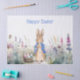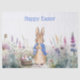 Pedro el conejo con un fondo de flores silvestres y un saludo de Pascua Feliz