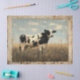 Una encantadora representación de una vaca blanca y negra en medio de un prado iluminado por el sol, pintada en un estilo rústico vintage. El marco de madera texturizada complementa la idílica escena pastoral.