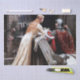Edmund Blair Leighton fue un pintor inglés de temas Regency y medievales. Esta pintura se llama "Godspeed" y representa a una mujer con el pelo rubio largo y un vestido que fluye sobre un balcón para conversar con un caballero con una brillante armadura sentado sobre un caballo blanco. La escena se desarrolla en un patio medieval de piedra con una arquitectura gótica al fondo.