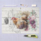 Una gallina de Leghorn y su chica detrás de un ramo de flores morado y rosa claro. Camarera, vintage, victoriano, con carteles en un fondo de tablero de madera, blanco y gastado. Perfecto para una casa de campo rústica o para un ambiente campestre francés, sobre todo haciendo artesanía de despuchadores.