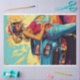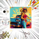 Un ilustracion estilizado de una persona parada al lado de un coche clásico. La persona está usando un gorra de gran formato, un top rojo y vaqueros de denim. El coche tiene ataúdes prominentes y faros redondos, indicativos del diseño automotriz estadounidense vintage. El fondo presenta pinceladas abstractas de colores amarillos, azules y rojos, lo que añade un toque vibrante y artístico a la escena