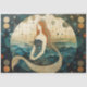 Mujer con el pelo largo rojo se convierte en una cola de pescado, pintura celestial primitiva con una noche luna y una hermosa sirena en el océano. en el estilo del arte primitivista, retrato ilusorio, paisaje marino.