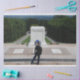 Un guardia uniformado de pie solemnemente a la atención frente a la tumba del soldado desconocido. El guardia está vestido con un uniforme militar formal, completo con un gorra, y se coloca hacia un sarcófago de mármol blanco que lleva una inscripción. El entorno es tranquilo, con árboles bien cuidados y setos en un cielo despejado. Esta escena transmite un profundo sentido de respeto y la continua vigilia mantenida en este importante monumento, que honra a soldados no identificados que han dado su vida en servicio.
