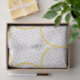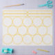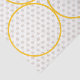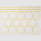 Los bordes amarillos delgados delimitan catorce tapones redondos de la tapa de la miel utilizando el mayor tamaño de papel tisular (20" x 30") impreso con un patrón de abejas reina. Utilice la plantilla de círculo como guía para hacer recortes anchos de 6" para ajustar la boca ancha y las tarros de albañil normales. Se pueden utilizar cuatro bandas coincidentes sobre los lados de los contenedores.