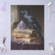 Un cuervo negro brillante, con un ojo rojo, se alza sobre una pila de libros curtidos, rodeado de cristales de amatista dispersos en terciopelo violeta profundo.