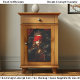 Un dramático retrato de fantasía oscura y romance gótico que presenta a una misteriosa mujer coronada que lleva una rica venda en los ojos de color carmesí mientras está rodeada de cuervos negros vigilantes. La figura se encuentra contra sombras profundas y cortinas de terciopelo oscuro, creando una atmósfera sombría y teatral. Su ornamentada corona antigua brilla suavemente contra su cabello auburn fluyente, mientras que la venda roja vívida en los ojos introduce un punto focal llamativo que contrasta hermosamente con las plumas oscuras de los cuervos reunidos alrededor de ella. Las aves parecen protectoras, inquisitivas y simbólicas, mejorando el sentido de misterio y folclore. La composición evoca temas de profecía, intuición, visión oculta y narración mítica, mezclando la elegancia gótica con el simbolismo de fantasía. La iluminación dramática y las text