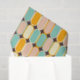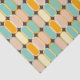 Retro geometric pattern with overlapping vertical ovals in shades of teal, peach, orange, and cream on a dark brown background. Vibrant and symmetrical.
