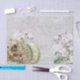 Rosas rosas y blancas, huevos moteados y un pájaro en su nido componen este collage de primavera vintage, con pergamino azul y texto francés en el fondo.
