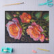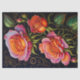 La obra cuenta con un rociado de rosas naranjas y rosas rosas rosas sobre un fondo negro.