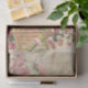 rosas rosas rosas en un jarrón con palomas blancas sentadas encima de una jaula de pájaros abierta. Todo sobre un fondo marrón angustiado. Perfecto para artesanías, envoltura de regalo y desacoplamiento. ¡Asegúrate de comprobar la bolsa de regalo correspondiente!
