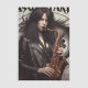 La cantante Zodiac Sagittarius está llena de roca y rollo con su pelo negro y su chaqueta de cuero mientras toca su saxofón frente a una pared industrial. ¡Es perfecto para artesanías como la desconexión!