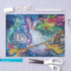 Colorida, caprichosa y divertida pintura acrílica de Bulgan Lumini (c). Noche de invierno nevada con muñeco de nieve, árbol de navidad, juguetes, gatos, búho, marionetas, plantas ornamentales y bayas huecas en colores vivos amarillo, azul, verde, rojo, rosa blanco, colores