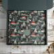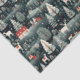 Una exuberante escena de invierno nevada con ciervos blancos recorriendo campos cubiertos de nieve, salpicados de casas de campo rojas y blancas y rodeados de abundantes pinos de invierno.