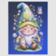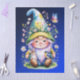 A charming and detailed digital illustration of a cheerful garden gnome sitting in the grass. The gnome wears a tall, light-blue hat brimming with wildflowers and daisies, and is joined by a tiny brown bunny and a blue tit bird perched on its boots. A vibrant butterfly flutters nearby against a deep blue gradient background, creating a magical and heart-warming spring scene.