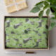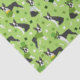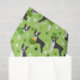 Cute St. Patrick's Boston Terriers vistiendo muchos matices de verde con sudaderas rayadas y de corazón con cuatro tréboles de hojas dispersas y huesos de perro en un fondo verde.