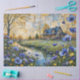 of pink, purple and blue flowers along a pretty flowing stream, with a patchwork sky