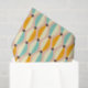 Symmetrical retro pattern with interlocking teal, yellow, and orange shapes on a beige background. Black star-like accents add contrast, creating a vintage feel.