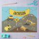 El ilustracion de una obra y el tema de los camiones. Entre los vehículos de transporte de camiones de construcción se incluyen camiones de volquete, excavadoras, retroexcavadoras, topadoras, grúas y cargadores de extremo delantero. El diseño perfecto para camiones y chicas de maquinaria pesada. Regalo navideño ideal, regalo de cumpleaños, decoración de guardería, arte en la habitación para niños, decoración en casa o de vuelta a la escuela. Personalizar el nombre y hazlo propio.