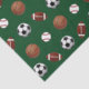 Regalo de amante de los deportes o tejido fiesta con estampado de fútbol, fútbol, baloncesto y béisbol sobre fondo verde.