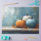 Una acogedora pintura impresionista de inspiración otoñal con tres calabazas, naranja, blanca y azul, sobre una mesa de madera templada. Las cálidas hojas de otoño y las pinceles texturadas realzan el encanto rústico de la casa de campo.