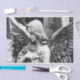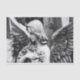 Un bello ángel sostiene rosas en el pecho y una expresión de serena tranquilidad en su cara. Fotografía en blanco y negro.