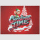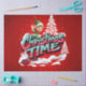 Un elfo personalizado alegre con ropa verde y oreja olas de un paisaje nevado. Las palabras "Tiempo del Navidad" están escritas en letras grandes, coloridas, de estilo graffiti, con un esquema de color rosa y azul. El fondo es rojo intenso, lo que sugiere un ambiente festivo. Los copos de nieve caen suavemente, añadiendo un toque de invierno.