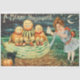 "Una Feliz Halloween." Postal vintage, aproximadamente 1910. Chica soplando un cuerno con tres Jack-o-Lantern."
