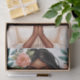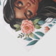 El papel tisular presenta un ilustracion floral de una bella mujer espiritual negra con el pelo largo, los ojos cerrados y las palmas apretadas juntas en posición de oración. La belleza de piel oscura parece serena mientras reza, y está enmarcada por una variedad de flores y hojas. Ella usa un vestido de estilo campesino. Obra artística botánica de la espiritualidad estética cottagecore femenina.