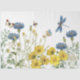 Ilustraciones de flores silvestres de época sobre un fondo floral pálido. Las flores incluyen achicoria, lavanda, camomila, encaje de la reina Ana, mariposa, hierba de prado y flor de maíz en una mezcla de amarillos, blancos y azules. Mariposas, una libélula y una abeja de miel están ocupadas polinizando el prado. Se podría utilizar como una gota para un jardinero o para un proyecto de desconexión o transferencia de muebles.