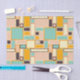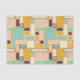 A vibrant abstract pattern with rectangles of varying sizes in teal, orange, peach, and cream tones, outlined in dark brown. Geometric and retro feel.