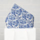 Este papel de tejido presenta un diseño floral azul y blanco.