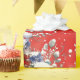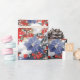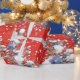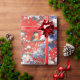 Papel de envolvimiento nostálgico festivo con un patrón de pájaros y ramas nevadas sobre un fondo rojo brillante.