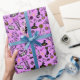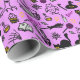 Papel envuelto con un diseño minimalista moderno para Halloween, un patrón de siluetas de una escoba, búho, telaraña, silueta de gato, bruja sobre un fondo rosado.
