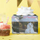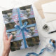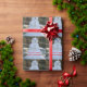 Invierno decorado con Cheery Snowman colgado en el bosque con rocas para los ojos, nariz y botones, ramas para la sonrisa y los brazos, y un gorra de mariscos y arbustos verdes. Texto que dice: NO abrir hasta que los Navidades tengan un color de fuente rojo. Mantenga el dicho o PERSONALICE el cuadro de texto e inserte su propio mensaje. Fotografía original © TamiraZDesigns.