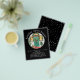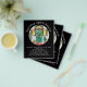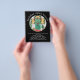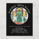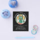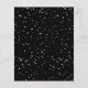 VALOR HOJA DE PAPEL VOLANTE SIN SOBRES. Invitación de Volante Negro de Fiesta de Casa Abierta de Navidad. Una alternativa más pequeña y económica de 4,5” x 5,6”. El encabezado está curvado alrededor de una ilustración circular de una puerta principal decorada festivamente, y un fondo negro coordinado con patrón de nieve está en la parte posterior. Personalice fácilmente el texto con sus propios detalles.