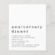 Una alternativa de PAPER (no tarjeta) de gran valor SIN ENVELOPES a un tamaño menor de 4,5" x 5,6" y a un precio económico. (Los sobres estándar A6 son el tamaño más próximo a caber). Invitación a la Cena Contemporánea de Aniversario Blanco Negro. La cabecera es grande en una elegante minúscula con los detalles debajo. En la parte superior hay mucho espacio blanco que le da un toque contemporáneo. Personaliza fácilmente el texto a tus propios detalles.