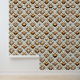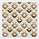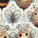 Abejas mullidas y caricaturizadas con cuerpos ondulados y pequeñas alas, dispuestas en un diseño repetitivo. Las abejas muestran diversas expresiones, con antenas rápidas y formas suaves y redondeadas, fijadas sobre un fondo claro adornado con espirales y corazones.