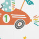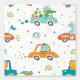 Animales de la selva Guay en coches con arcos de lluvia y estrellas. Cocodrilo, león, jirafa y oso. Colores claros sobre fondo blanco.